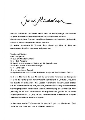 Mit ihrer brandneuen CD SMALL TOWN setzt die stimmgewaltige charismatische Sängerin JONI MADDEN ein leidenschaftliches, musikalisches Statement.