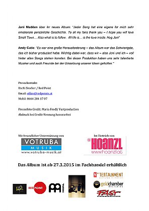 "Jeder Song hat eine eigene für mich sehr emotionale persönliche Geschichte. To all my fans thank you – I hope you will love Small Town… Also what is to follow. All life is… is the love inside. Hug Joni"